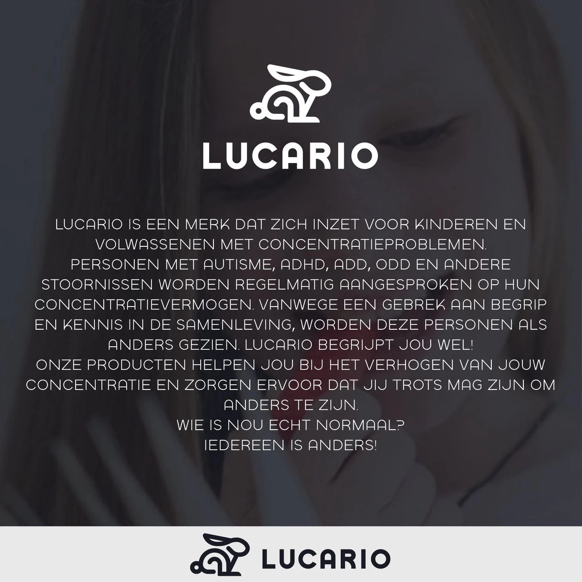 Lucario zet zich al jaren in voor kinderen en volwassenen met concentratie problemen. Vaak worden kinderen met concentratiestoornissen zoals ADHD, ADD, ODD en Autisme vergeten. Mensen vinden het moeilijk om zich in hun schoenen te plaatsen. Ze begrijpen vaak niet hoe moeilijk het kan zijn om je door verschillende prikkels niet te kunnen focussen op alledaagse bezigheden. Lucario begrijpt deze mensen wel. Speciaal voor deze groep ontwikkelde Lucario de bijtketting. Door te bijten op de bijtketting wordt het brein gedwongen zich te focussen. Hierdoor wordt het makkelijker om ongewenste prikkels van buitenaf te negeren en focus te behouden.