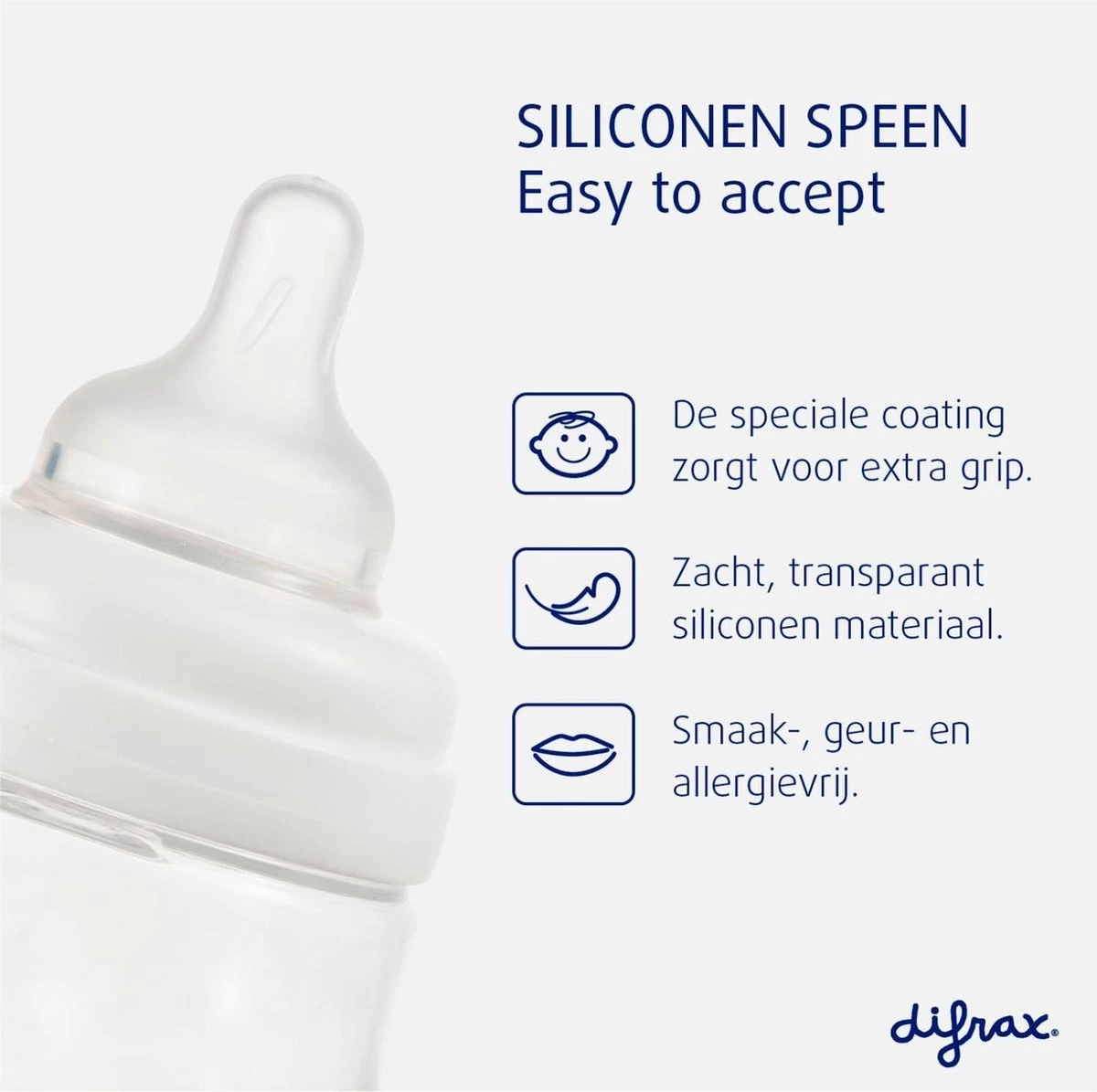 De speciale coating op de speen zorgt voor een extra soft grip. De flessenspeen heeft een zachte ronde tepelvormige speen die lijkt op de moederborst.