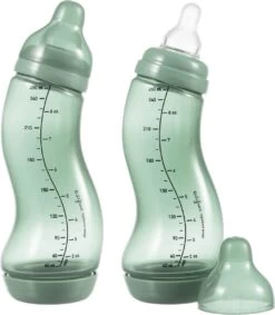 De groene 250 ml Difrax S-fles heeft een unieke S-vorm die zorgt voor een constante stroom van voeding. Het speciale ventiel in de bodem zorgt ervoor dat lucht niet mengt met de voeding, hierdoor blijven alle voedingsstoffen behouden.