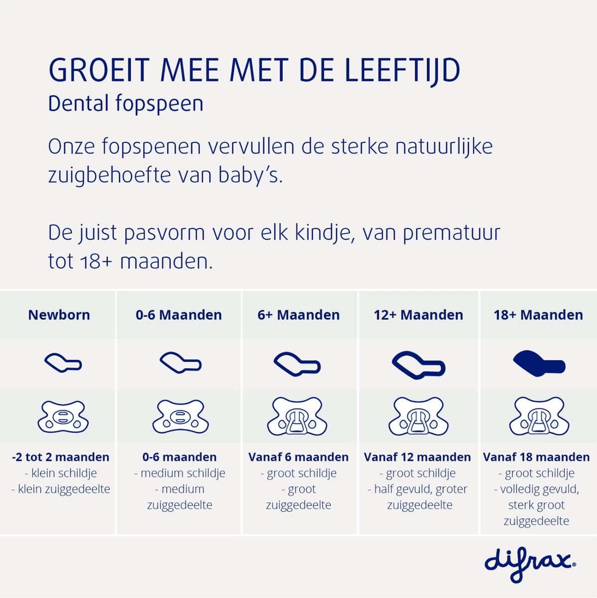 Difrax dental fopspenen zijn verkrijgbaar in 5 maten: Newborn, 0-6 maanden, 6+ maanden, 12+ maanden en 18+ maanden. De zuiggedeeltes en schildjes van onze fopspenen worden steeds een maatje groter en veranderen mee met de leeftijd van je kindje. Onze Newborn speentjes zijn ook te gebruiken voor premature baby’tjes.