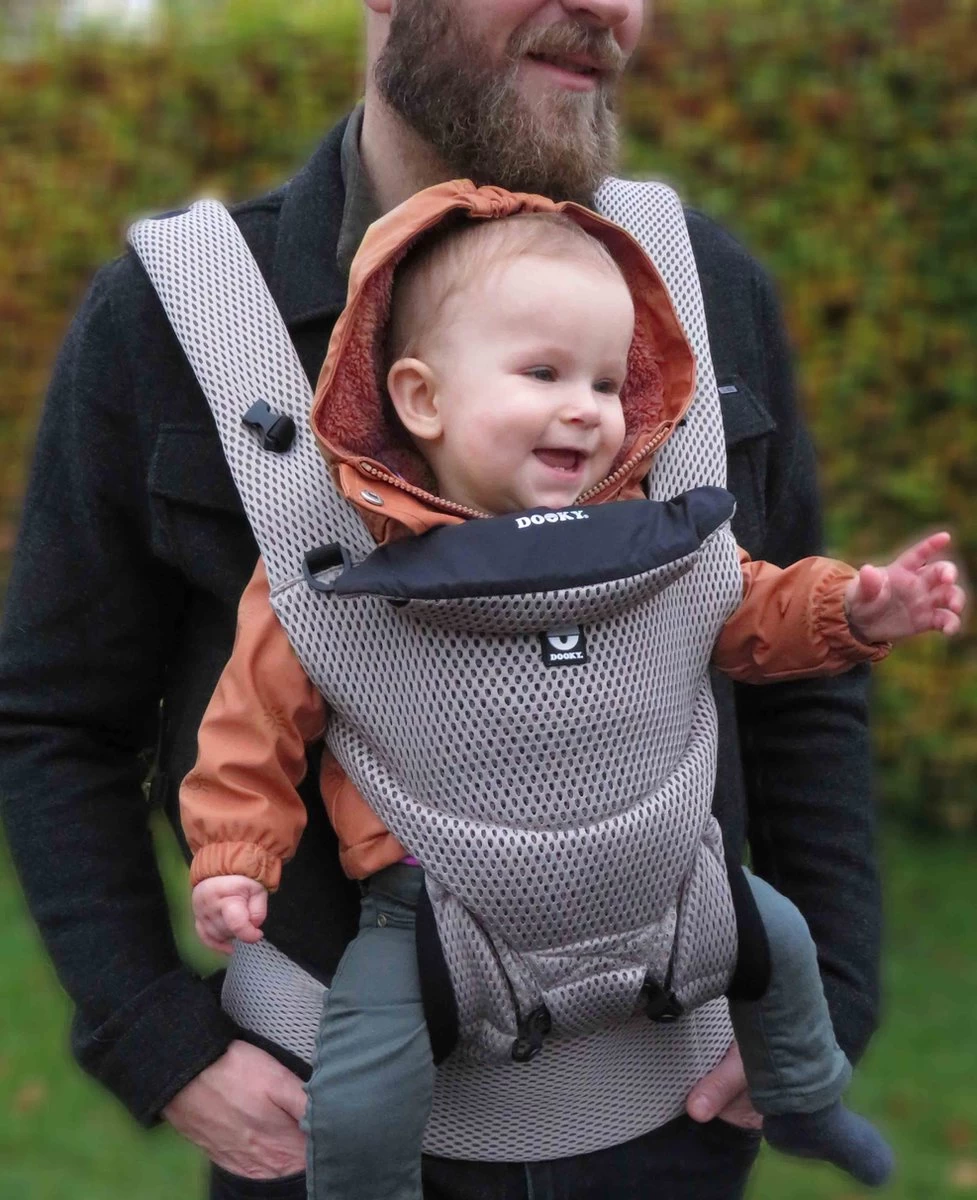 De Dooky draagzak ziet er niet alleen trendy uit, je baby zit er ook op de juiste, ergonomische M-positie in, met de knietjes hoger dan de billetjes. Zowel de zitting als de beensteuntjes zijn verstelbaar. Hij is gemaakt van 3D ademend meshstof voor een uitstekende ventilatie.
