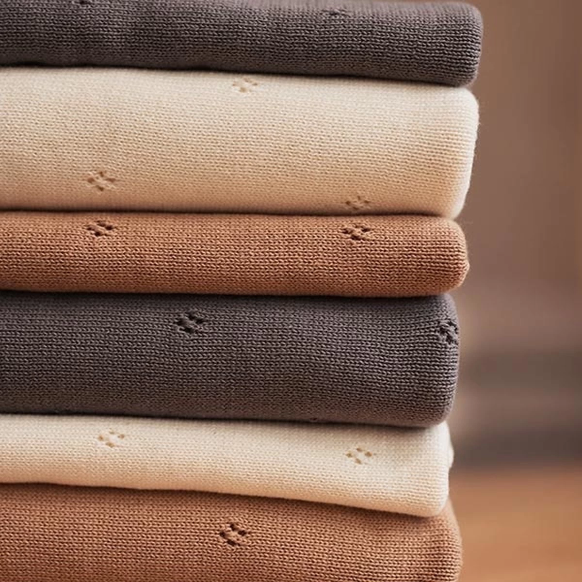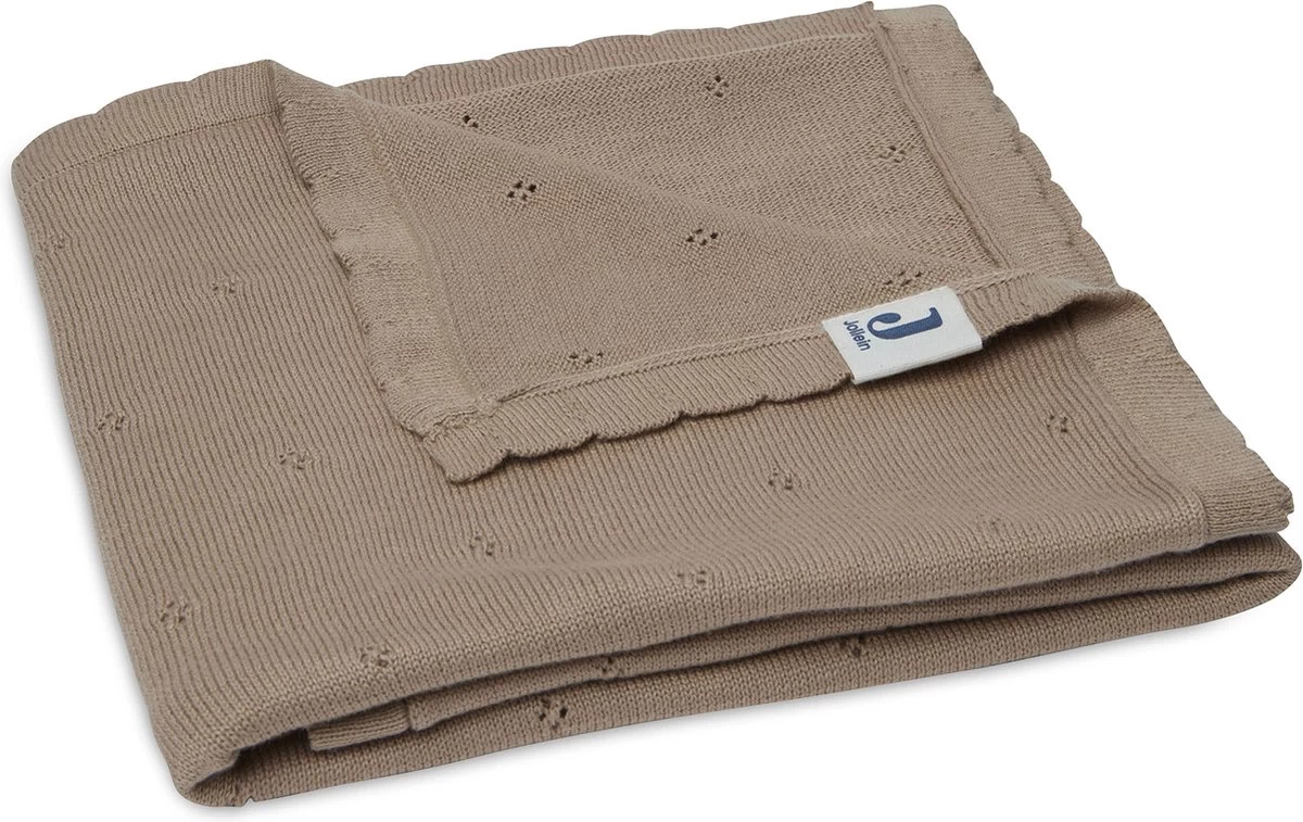 Het Pointelle dekentje shop je in de kleuren ivory, strom grey en biscuit in de formaten 75×100 cm voor de wieg en 100×150 cm in het ledikantje.