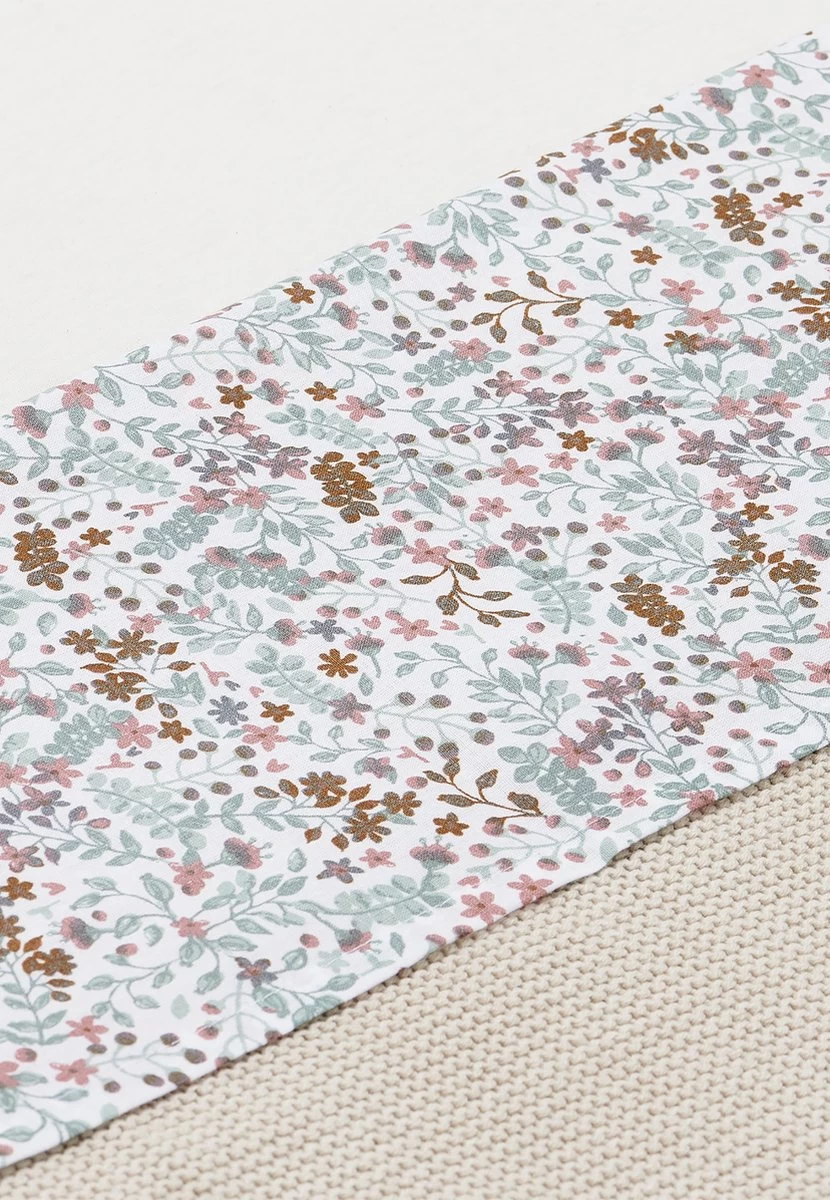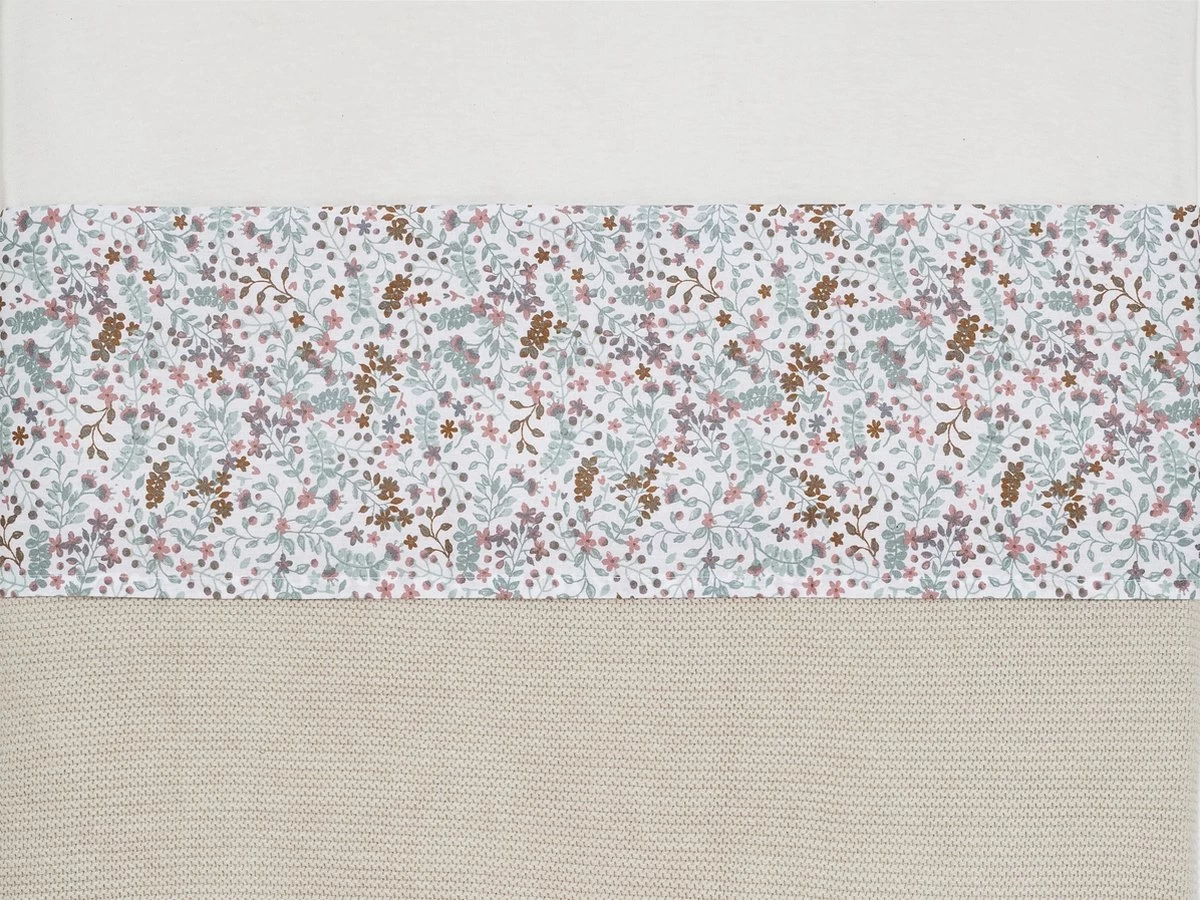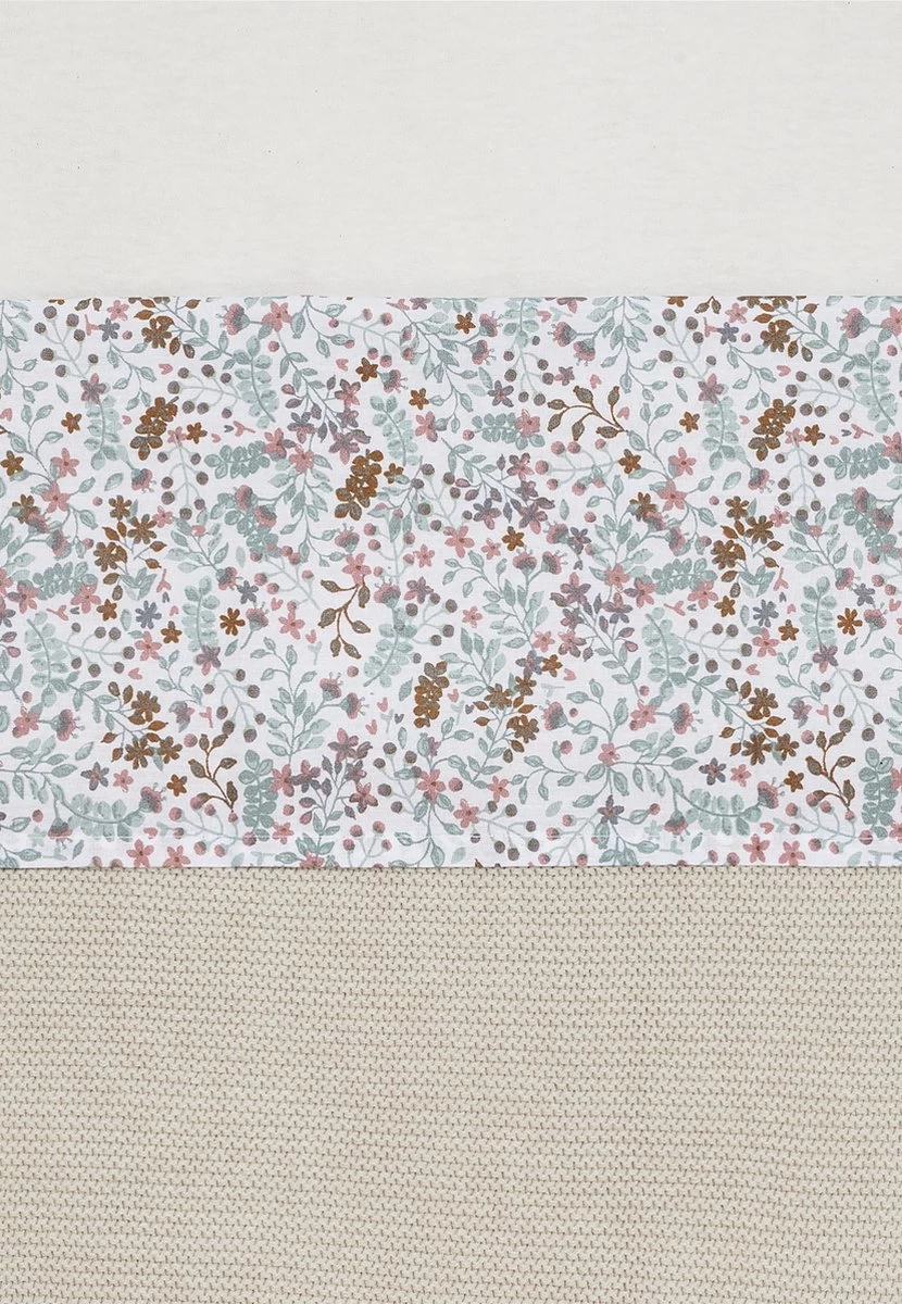 Dit laken lijkt wel een romantische bloementuin met de all over bloemenprint in roze, groen en caramel en combineert door deze meerkleurigheid met zoveel effen dekens. Ook combineert dit geweldig met de vintage sluiers en klamboes.