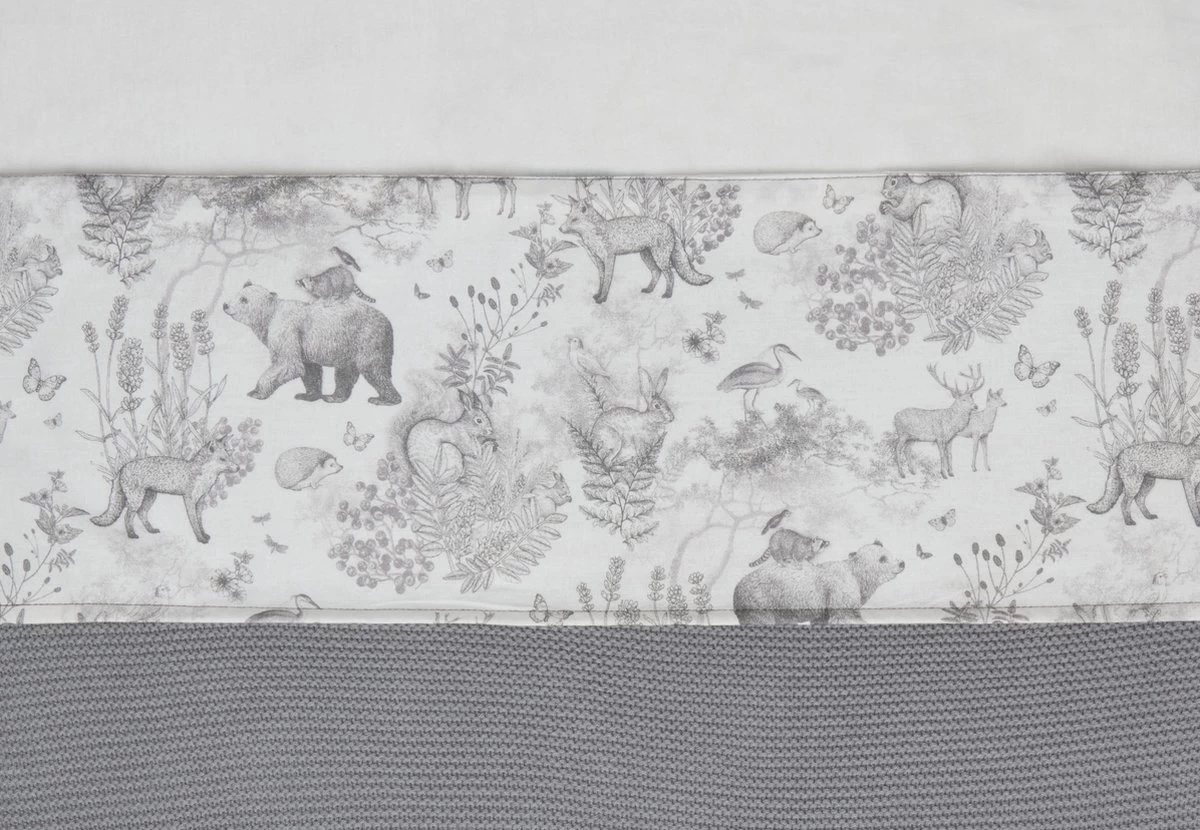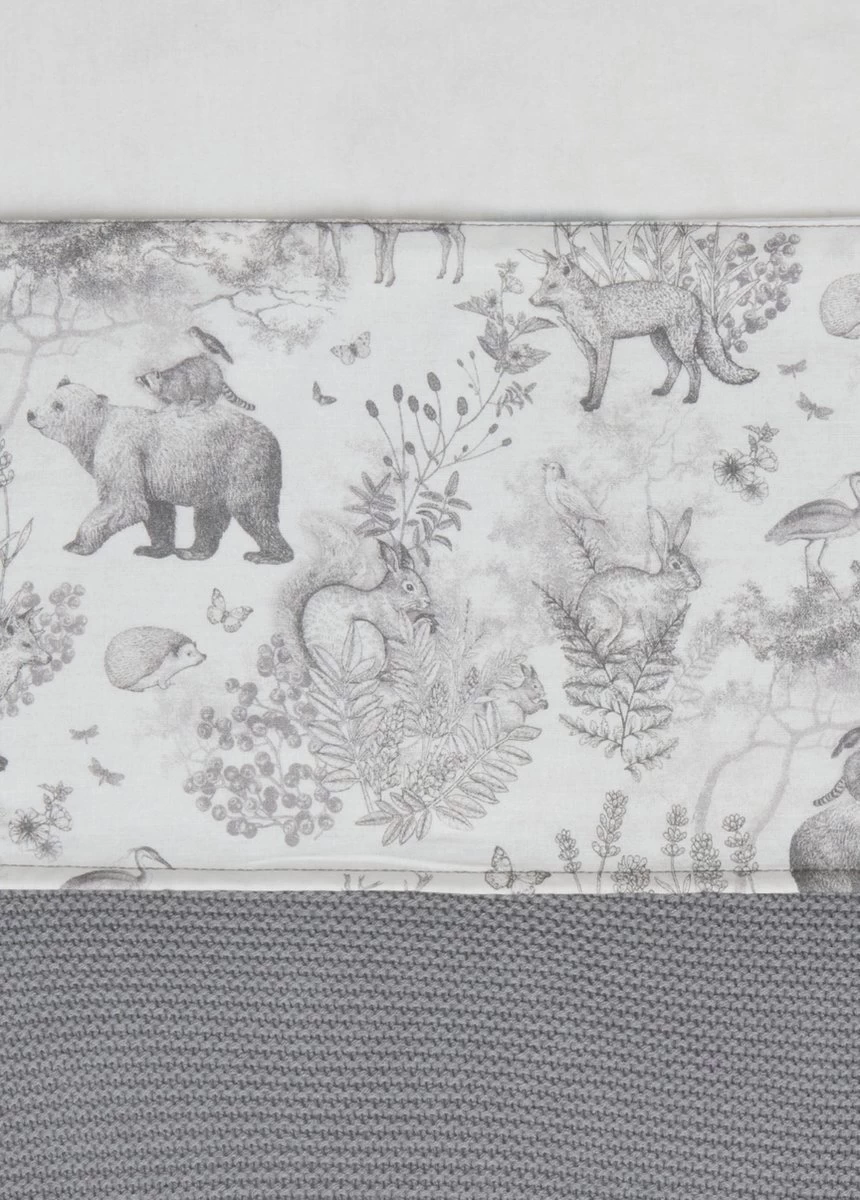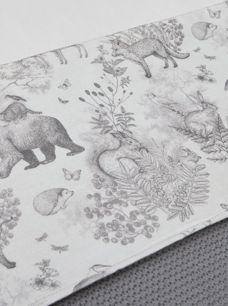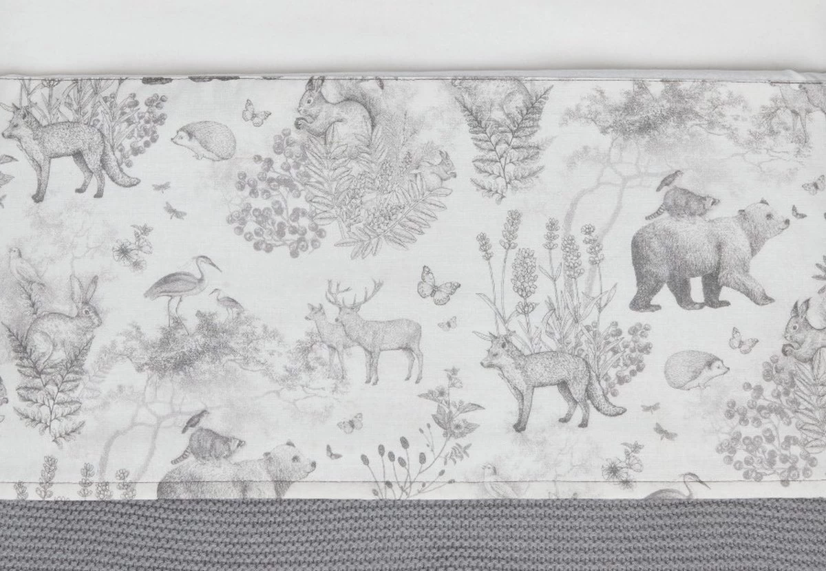 Op elk item zie je het lieve bosdieren printje terug, sommige met een grote panelprint, sommige met een all-over printje. De print heeft een off-white ondergrond met een grijze print.