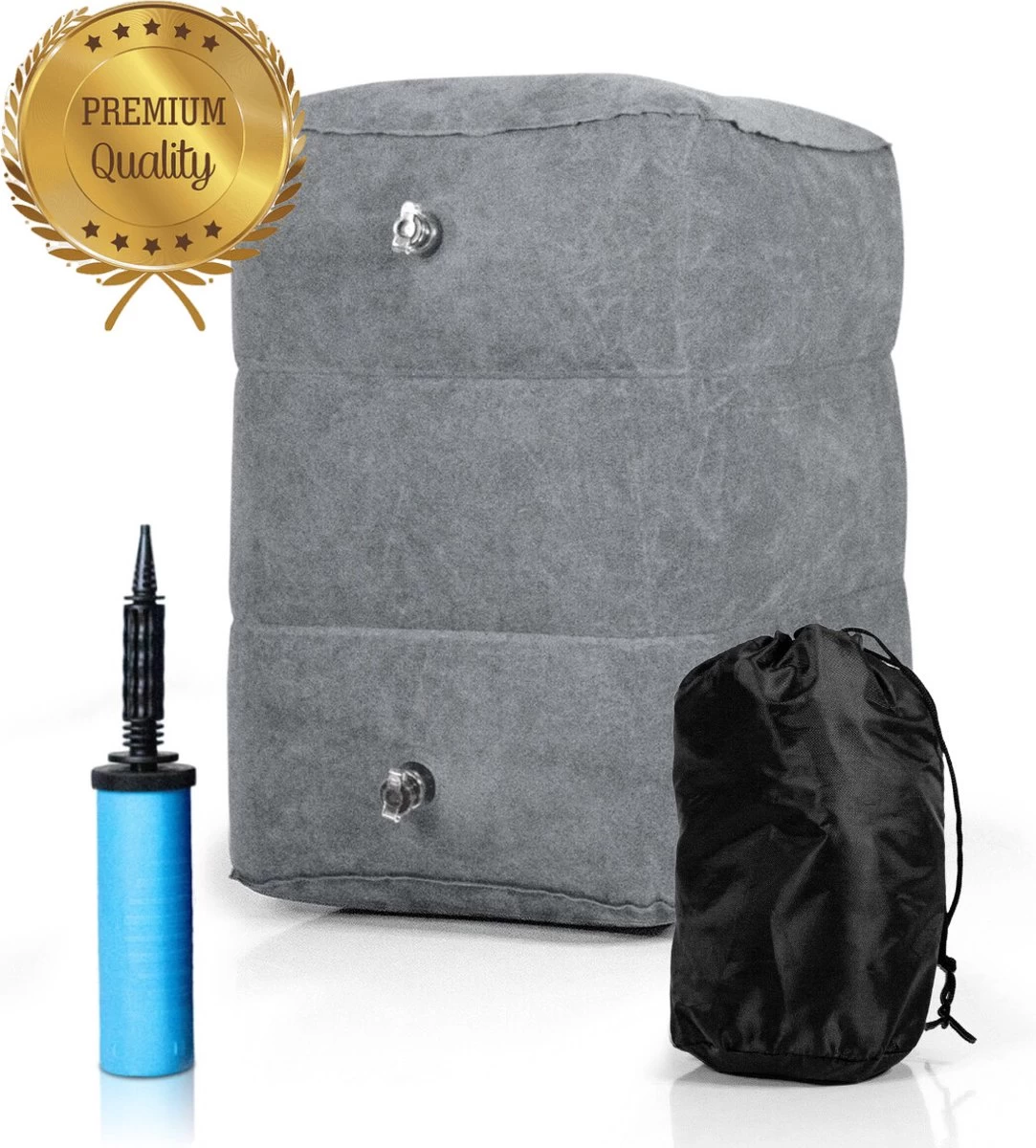 Ons kussen is van zeer goede kwaliteit en voelt erg zacht aan. Dankzij onze innovatieve aanpak zijn onze voetkussens lekvrij, in tegenstelling tot die van onze concurrenten. Het oppompen duurt slechts een halve minuut met de meegeleverde pomp!