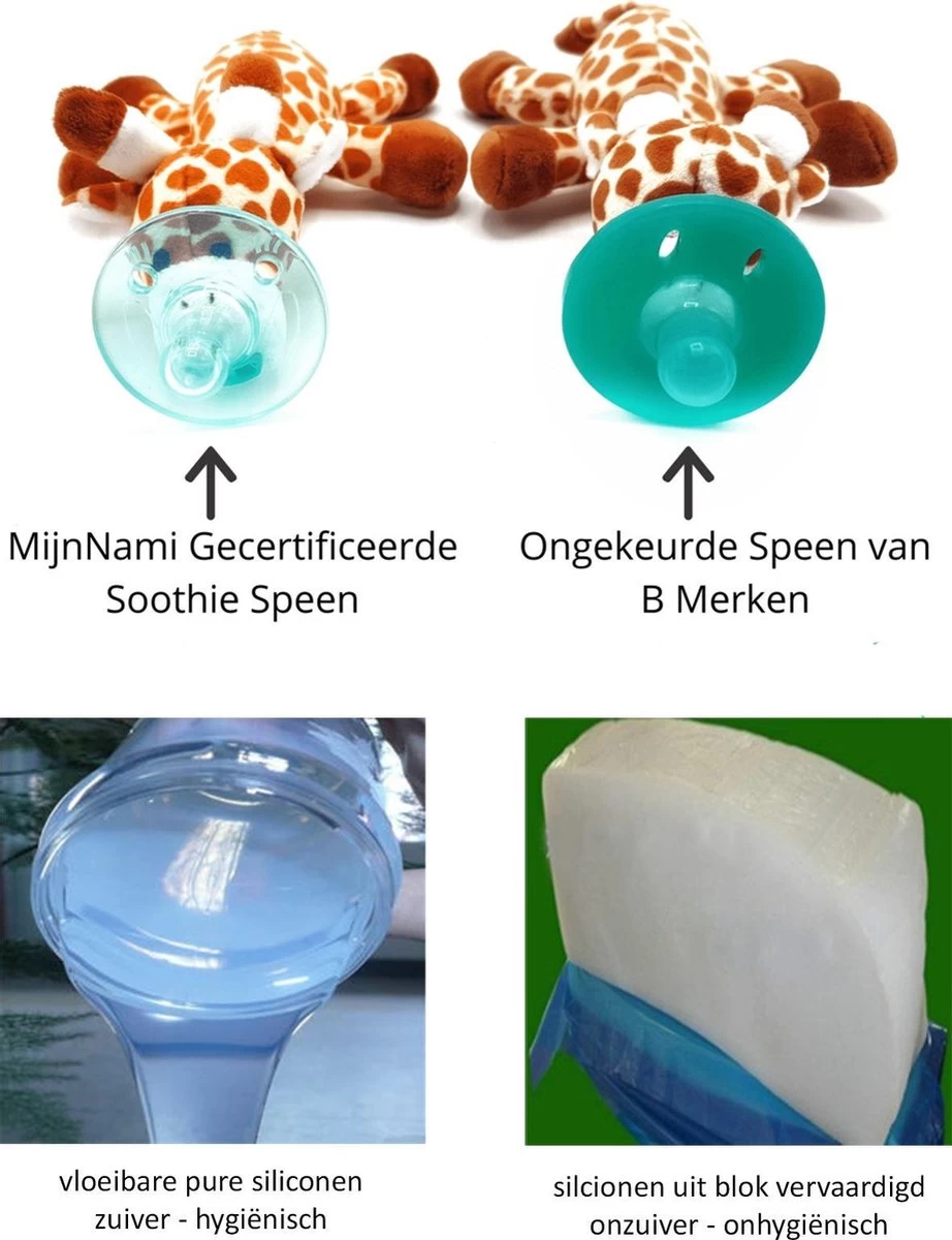 De MijnNami Soother Speen is gemaakt van 100% voedselgraad siliconen, gevormd uit pure siliconen. Geschikt voor prematuren en pasgeboren baby’s.