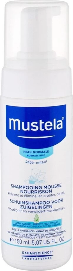 Baby schuimshampoo voor zuigelingen, ter preventie en verzorging van melkkorstjes, geschikt voor dagelijks gebruik.