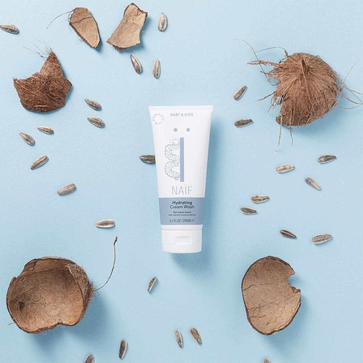 Naïf’s Wascrème hydrateert én reinigt mild door de toevoeging van kokosnoot, katoenzaad en zonnebloemolie. Extra hydratatie in een vrolijke tube!