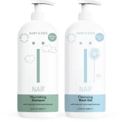 De Shampoo & Wasgel 500ml van Naïf bevat alles voor een verzorgde huid en schone haren: een voedende shampoo en een milde wasgel. En dat in een handige voordeel verpakking.