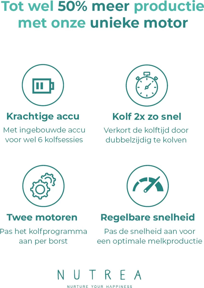 Met de unieke motor van onze DoubleFlow haal je tot wel 50% meer productie dan met andere kolven. De kolf heeft twee motoren en je kan per motor de zuigkracht en snelheid aanpassen. Hierdoor kan je het kolfprogramma volledig aanpassen aan jouw behoefte om zo comfortabel en efficiënt mogelijk te kolven.