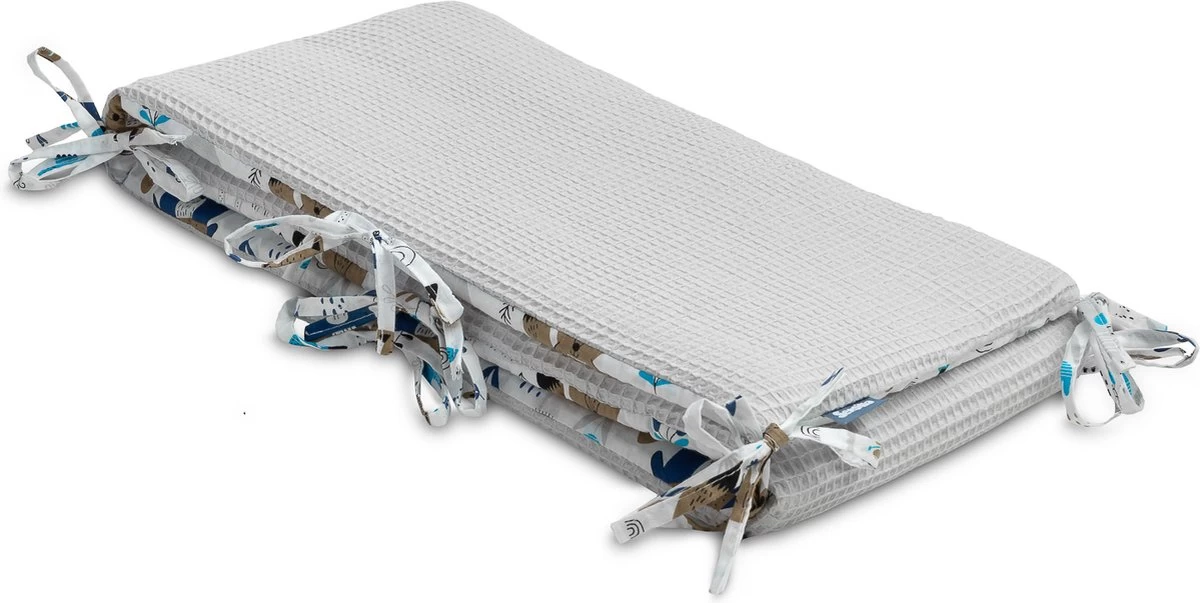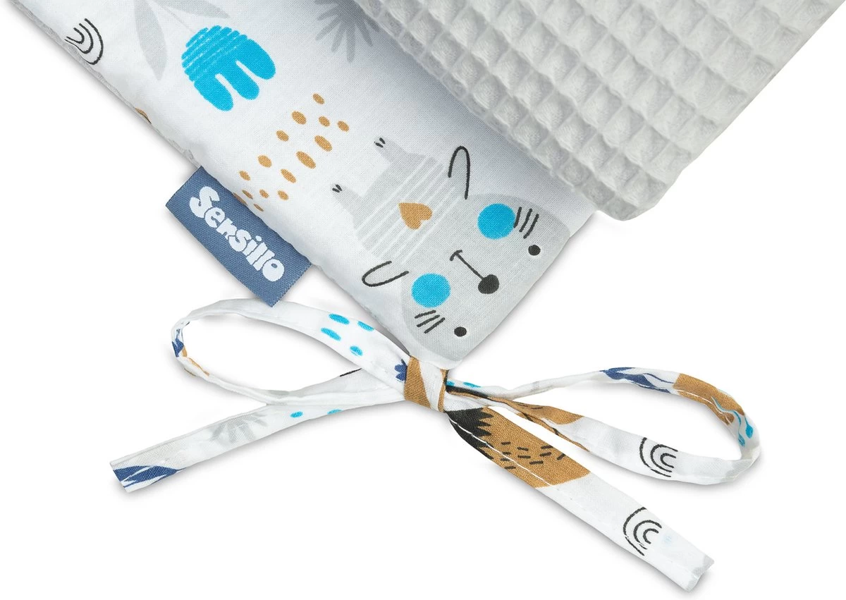 De dunne bedbumper van Sensillo is een alternatief voor de dikke en zware bumpers die veel gebruikt worden in kinderbedden. De dunne anti-allergische eivormige vulling zorgt voor voldoende isolatie, beschermt het kind tegen verwondingen tijdens het bewegen in het bedje en is vooral veilig en minimaliseert het risico op verstikking. De unieke uitstraling van de bumper bestaat uit een combinatie van twee materialen. De ene kant is gemaakt van een zacht en prettig aanvoelend katoen met een wafelstructuur en de andere kant is gemaakt van katoen met een kleurrijke print. Beide stoffen zijn Oeko-Tex gecertificeerd. Om de 30 cm zorgen ingenaaide linten ervoor dat de bumper goed op zijn plaats blijft.