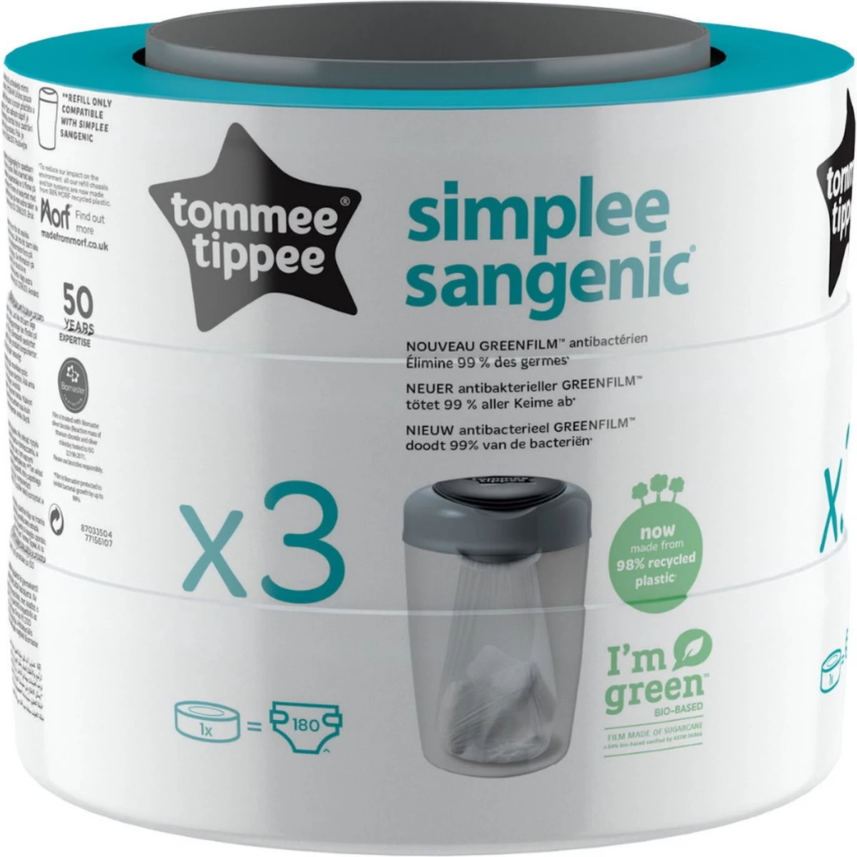Om de impact op het milieu te verminderen, zijn de Simplee Sangenic-luieremmer en het navulchassis gemaakt van 98% gerecycled en volledig recyclebaar plastic, terwijl onze meerlaagse, antibacteriële GREENFILM™ nu biobased is en gemaakt is van duurzaam geproduceerd suikerriet.