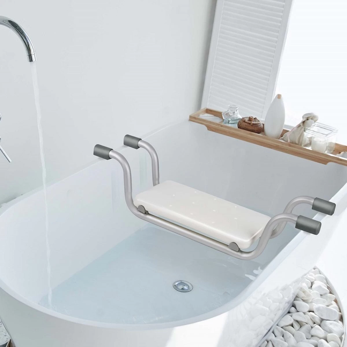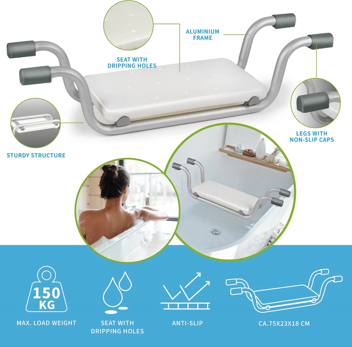 Let op: dit badzitje is enkel geschikt voor baden met een rechthoekige vorm. Baden met een speciale afmetingen zoals een hoekbad of extra breed bad zijn niet geschikt voor deze badstoel. Gebruik voor extra stevigheid ook een anti-slip mat voor de voeten in bad.