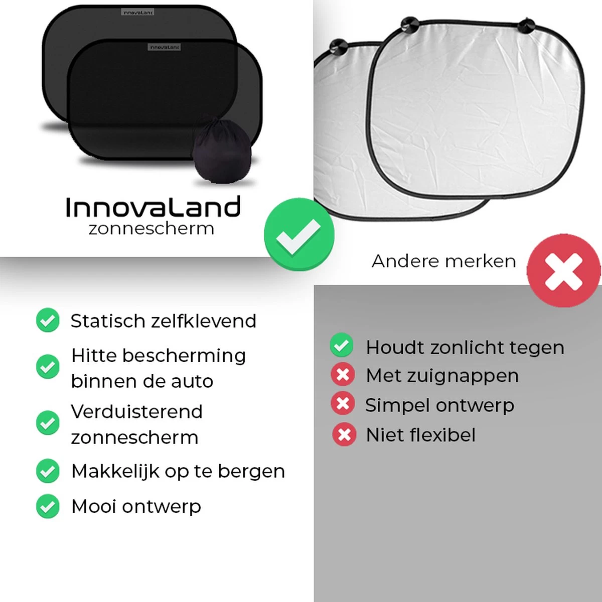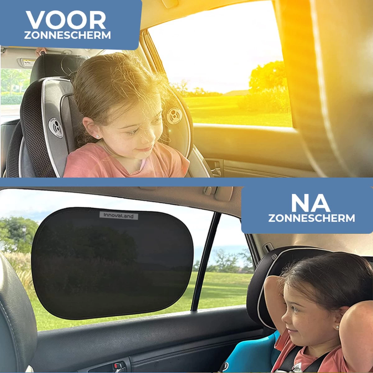 Zorg goed voor jezelf en de mensen om je heen. Een krachtige zon en UV straling kan zeer schadelijk zijn voor de huid en de ogen, dus bescherm iedereen met een goed zonnescherm. Het is ideaal voor op vakantie en tijdens andere (lange) autoritten. De Innovaland zonneschermen houden meer licht tegen dan andere zonneschermen, waardoor ook jonge kinderen zeer comfortabel en koel in de auto zullen zitten.